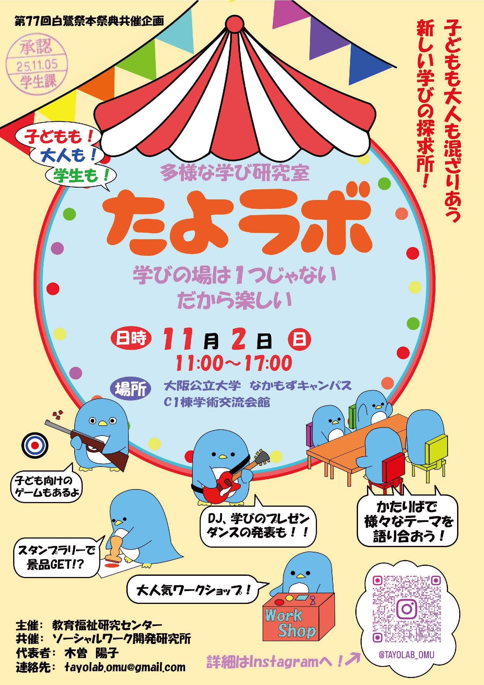 大阪公立大学 第77回白鷺祭にて、多様な学びを実践する居場所やフリースクールが集う『たよラボ』にオフネットから、えこじぇむ、テックスクールチャレンジ、ろ~たす、わなどぅが参加します☺
